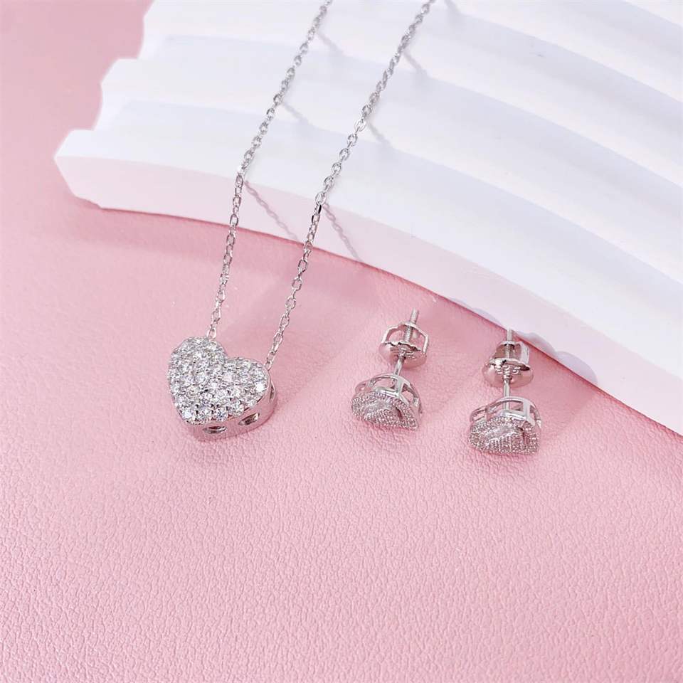 Round Cut Diamond Heart Shape Pendant And Earrings For Women