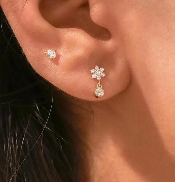 Round Cut Diamond Stud Earrings, Flower Drop Earrings, 14K Solid White Gold Dainty Diamond Women Earrings, Lab Grown Diamond