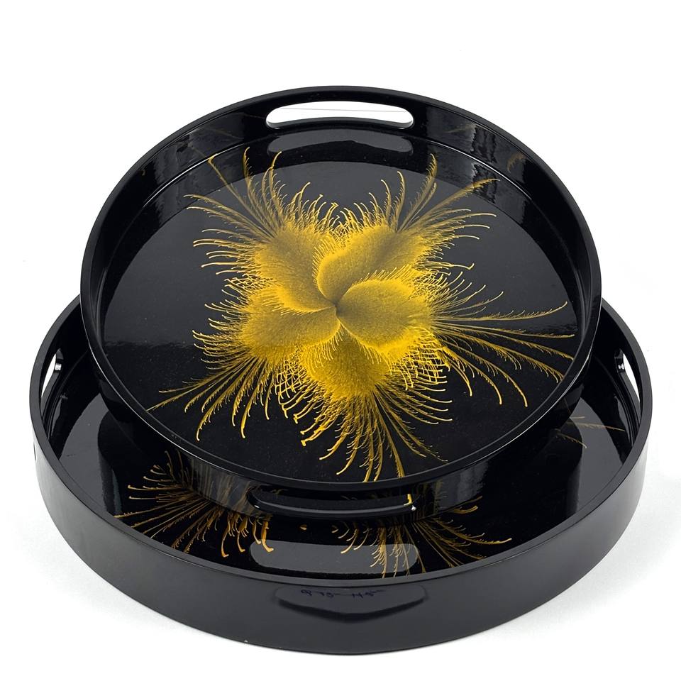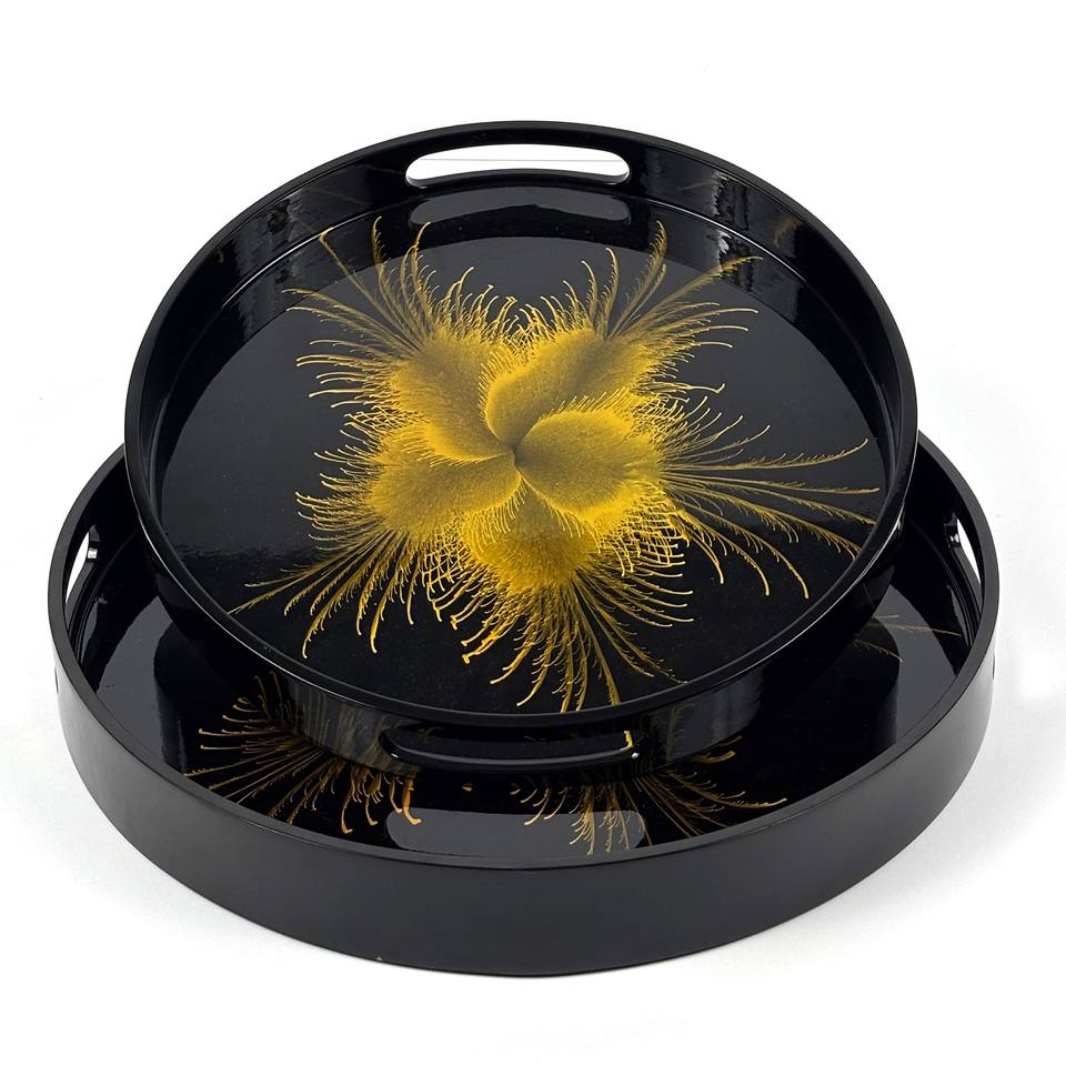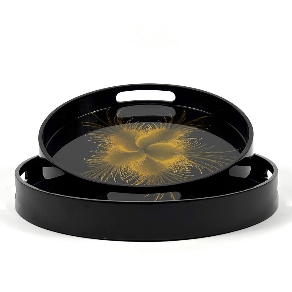 Round MDF Lacquer Serving Tray Glossy Finish and Printed Abstract Golden Flower Design Decorative Handmade Black Wooden Tray