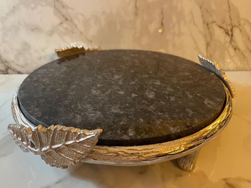 Round Marble Top Cake Stand With Gold Leaf Design Edge For Home Events Guest Hosting Dessert Display Table Decor Gifting Use