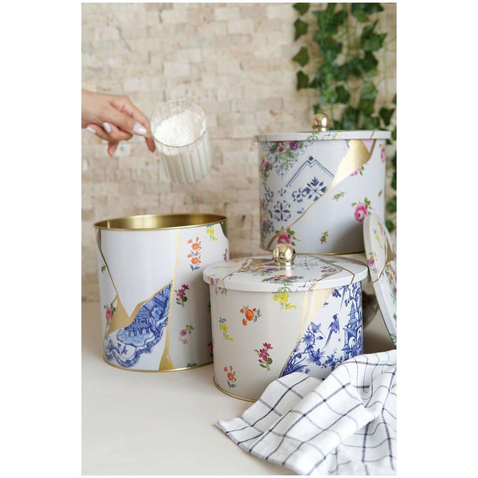 Round Metal Tin Canister Set Dia 175 mm ( 3Pcs) Kintsugi Gold vein Flower Kint Sugi Design