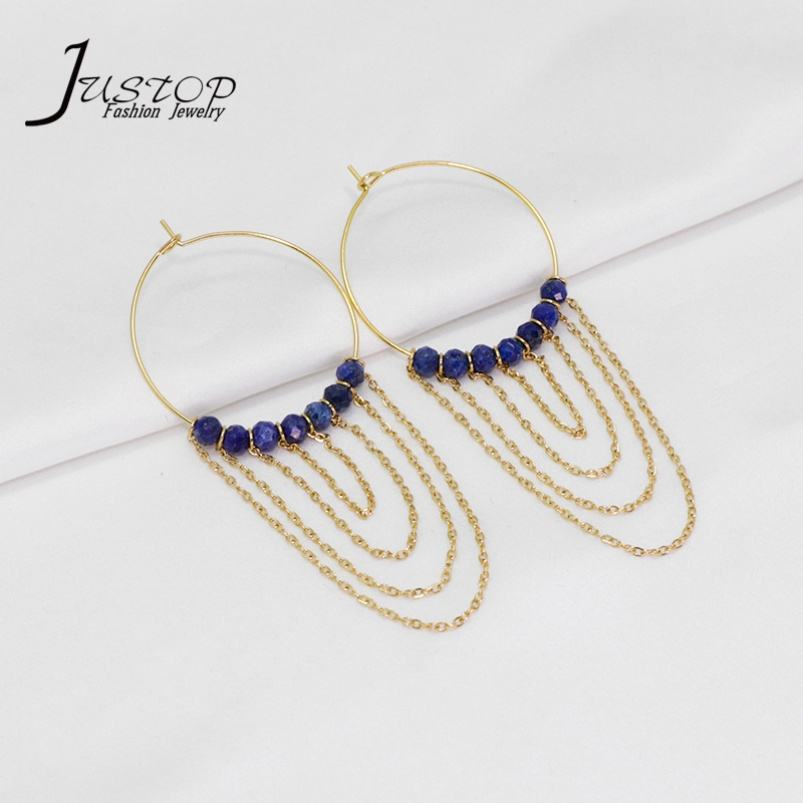 Round Natural Stone Amethyst Blue Topaz Rose Gold Chain Dangle Hoop Jewelry Earrings Boho Long Seed Bead Tassel Earrings