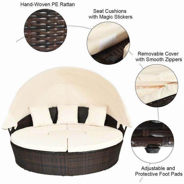 Round Patio Daybed with Canopy Rattan Furniture Set for Garden Sofas