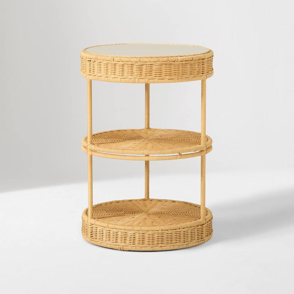 Round Rattan Double Shelf Handmade Wicker End Table Natural Cane Shelf Small Accent Table for Living Room Bedroom Balcony