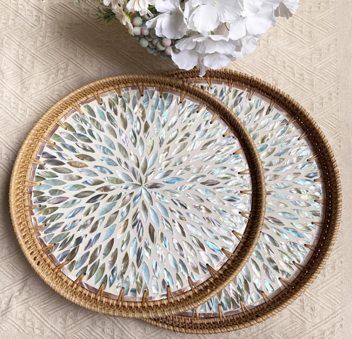 Elegant Rattan Serving Tray with Pearl Inlay Eco-Friendly Durable Wooden Base Wicker Basket for Food Storage & Display