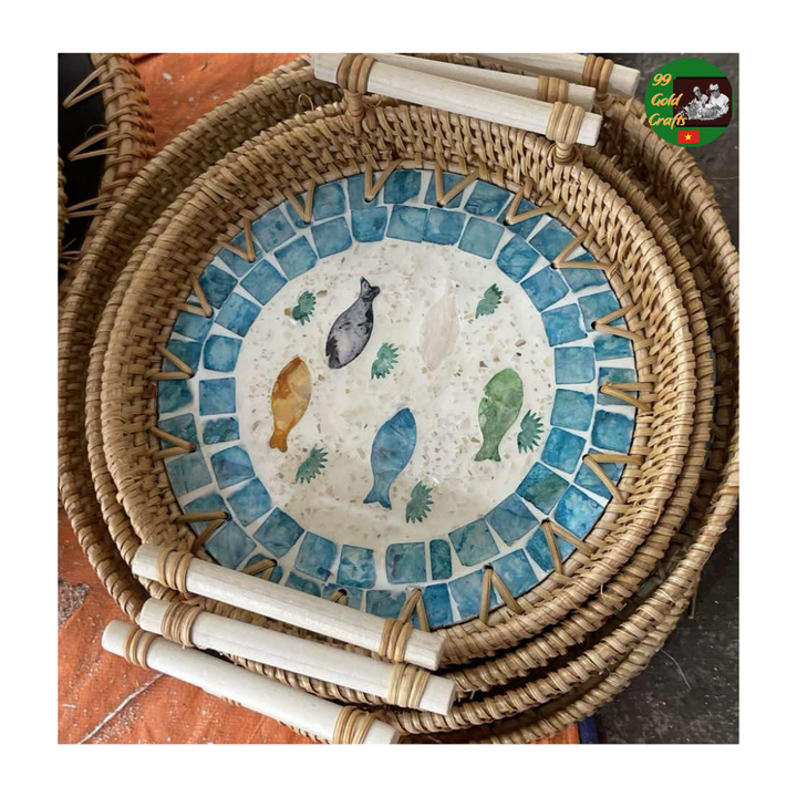 Round Rattan Tray with Mother of Pearl Inlay, Rattan Serving Tray, Rattan Serving Tray Mother Pearl Finish for Catering Tea