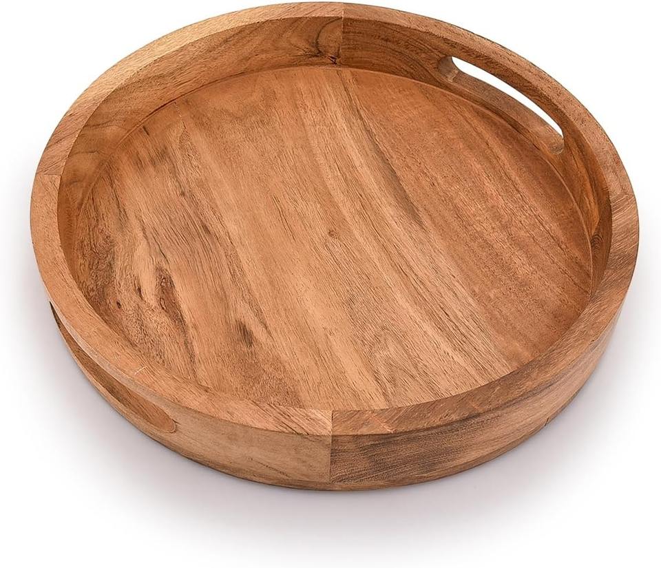 Round Serving Acacia Wooden Tray with Handles for Serving Beverages Tea Plate Dessert Dinner Breakfast Plate Storage Trays