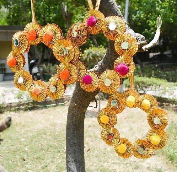Round Shape Gota Wall Hanging String for Ceiling Decoration Fabulous Mirror Work Gota Pom Pom Garlands for Stage Backdrop