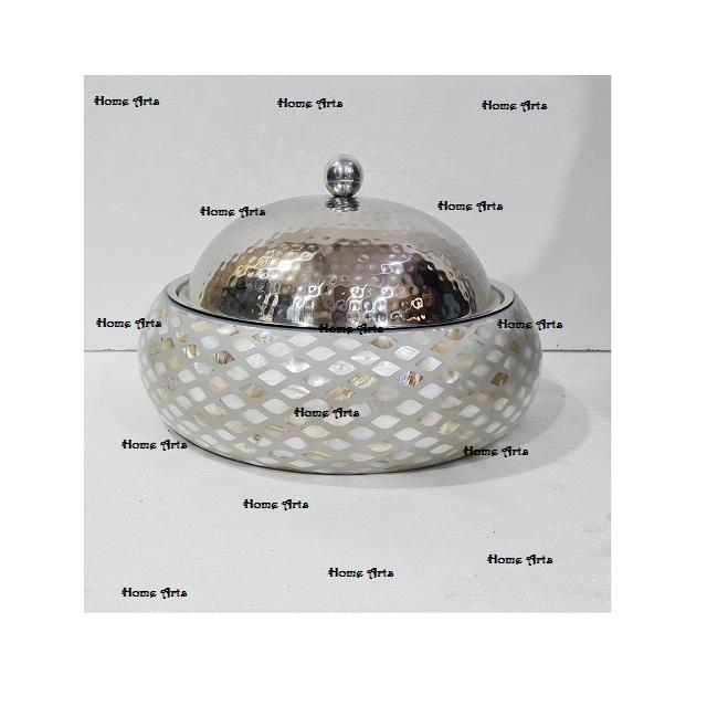 Handmade Wood And MOP Food Serving Hot Pot With Steel Hammered Lid Deluxe Quality Food Casserole Dish For Restaurant