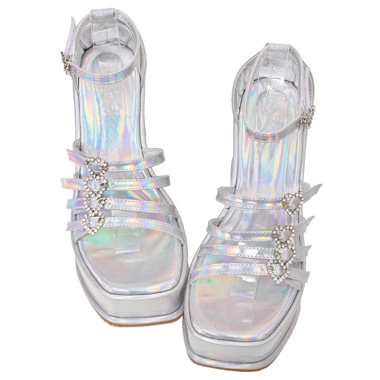 Round Toe Silver Wedge Sandals with Quad-Strap Design Padded Anti-Friction Heel Cushion 10CM Heel Height