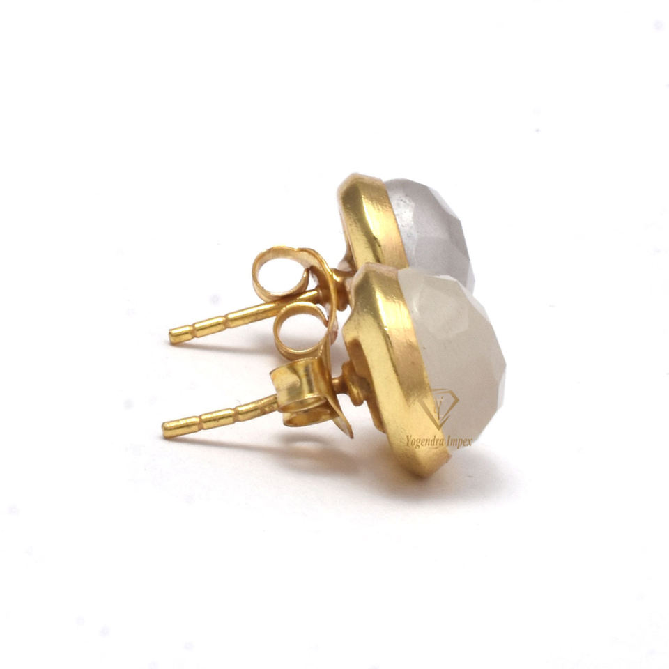 Round White Monalisa Quartz Gemstone Stud Earrings 925 Sterling Silver, Handmade Bezel Set White Gemstone Stud Earring For Women