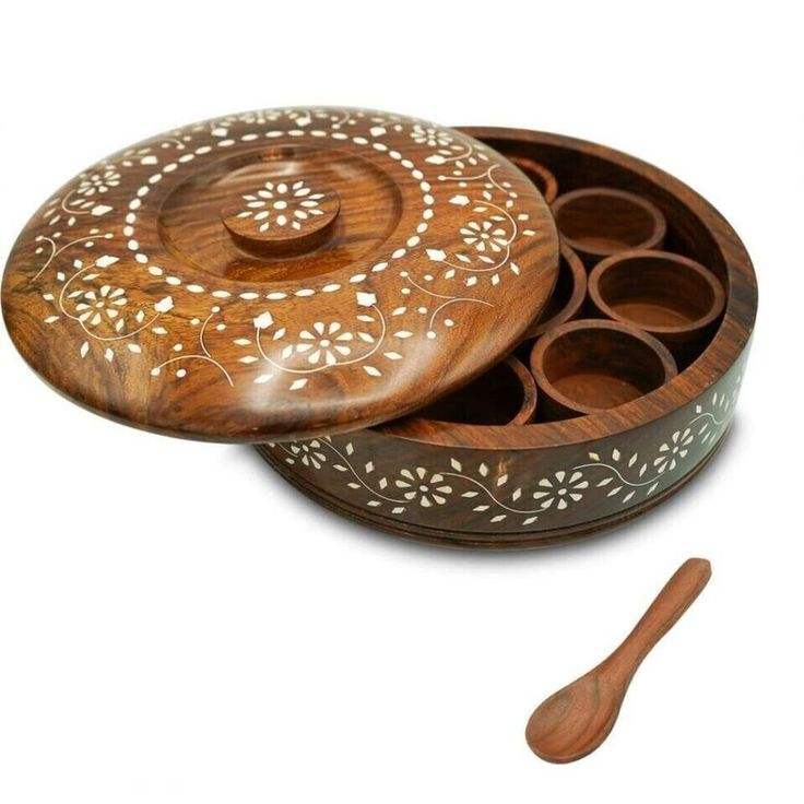 Round Wooden Masala Box With Inner Compartments For Organizing Turmeric Chili Coriander And Garam Masala