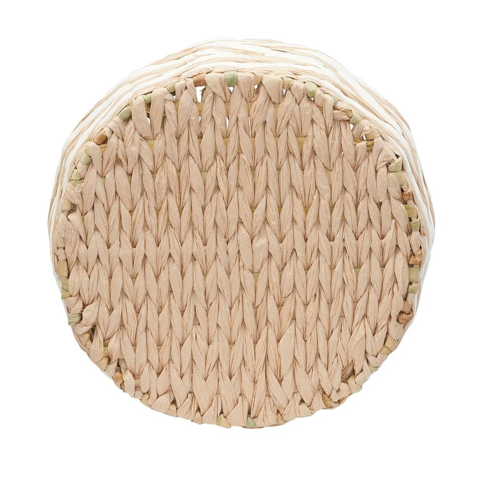 Round basket of water hyacinth in natural color with white accents