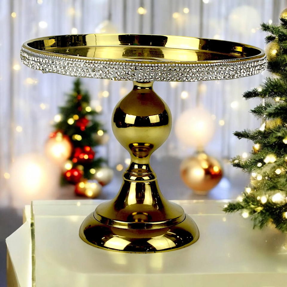 Round crystalled metal cake stand with floral embossing and mirror top, ideal for elegant parties, now sold at wholesale prices