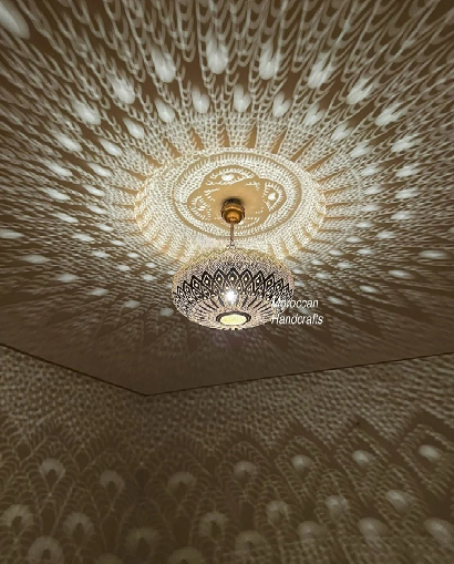 Round flat bowl Moroccan lamp chandelier, detailed perforated metalwork casting a dramatic lotus flower shadow design.