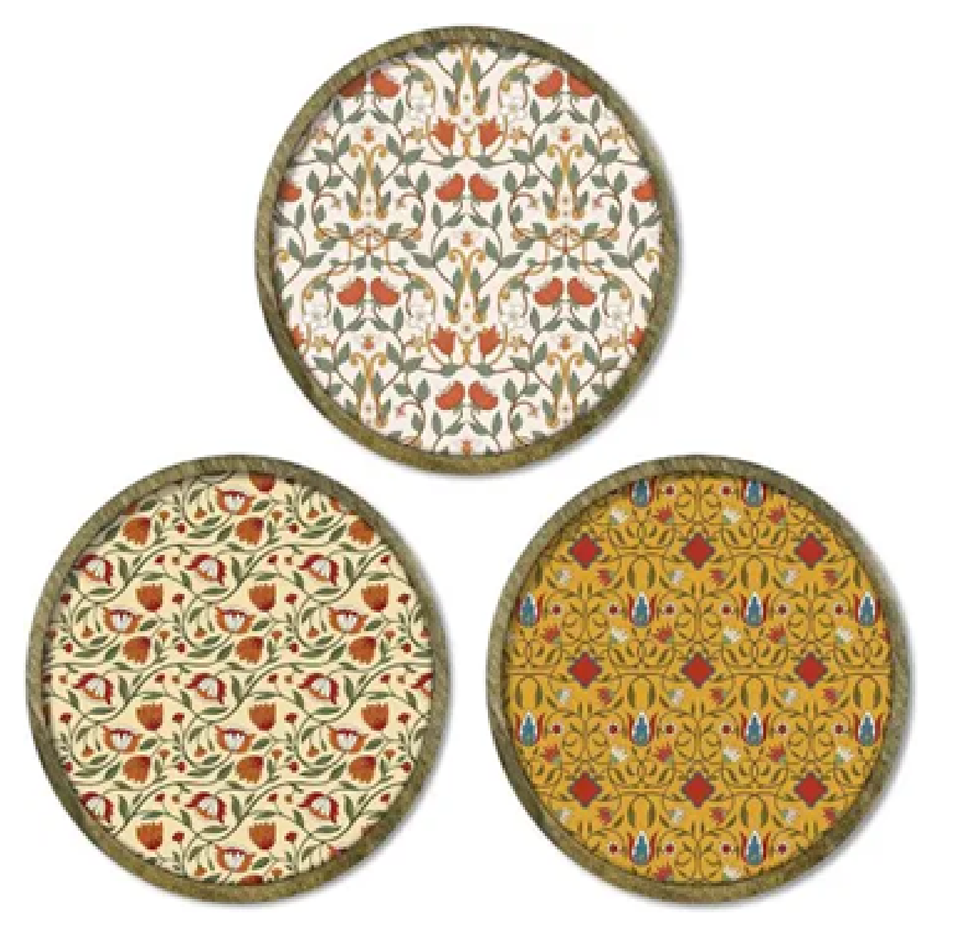 Round metal wall plates featuring diverse designs including elephants, palm trees, intricate floral patterns in bright colors