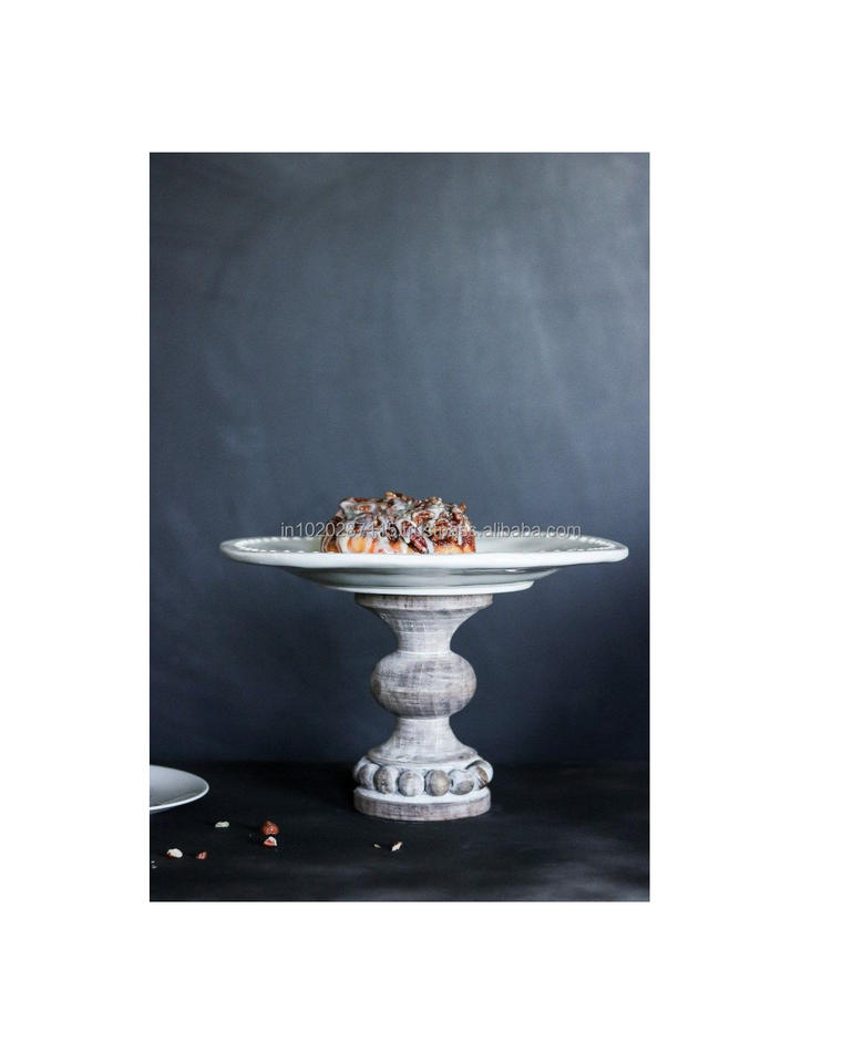 Round pedestal wooden cake stand for layered cake presentation and elegant vintage dining setup with handmade quality