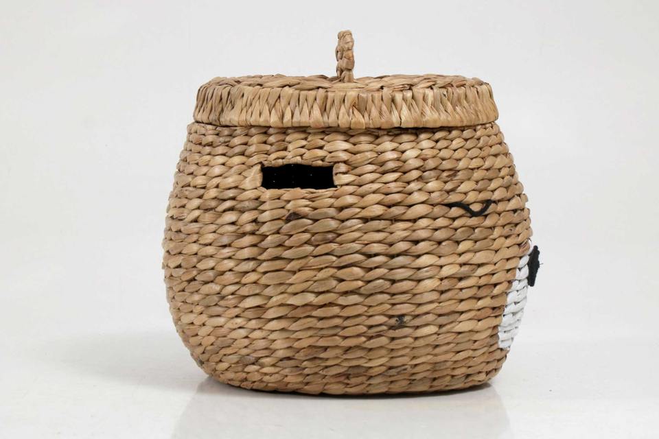 Round water hyacinth basket with cute bear face pattern