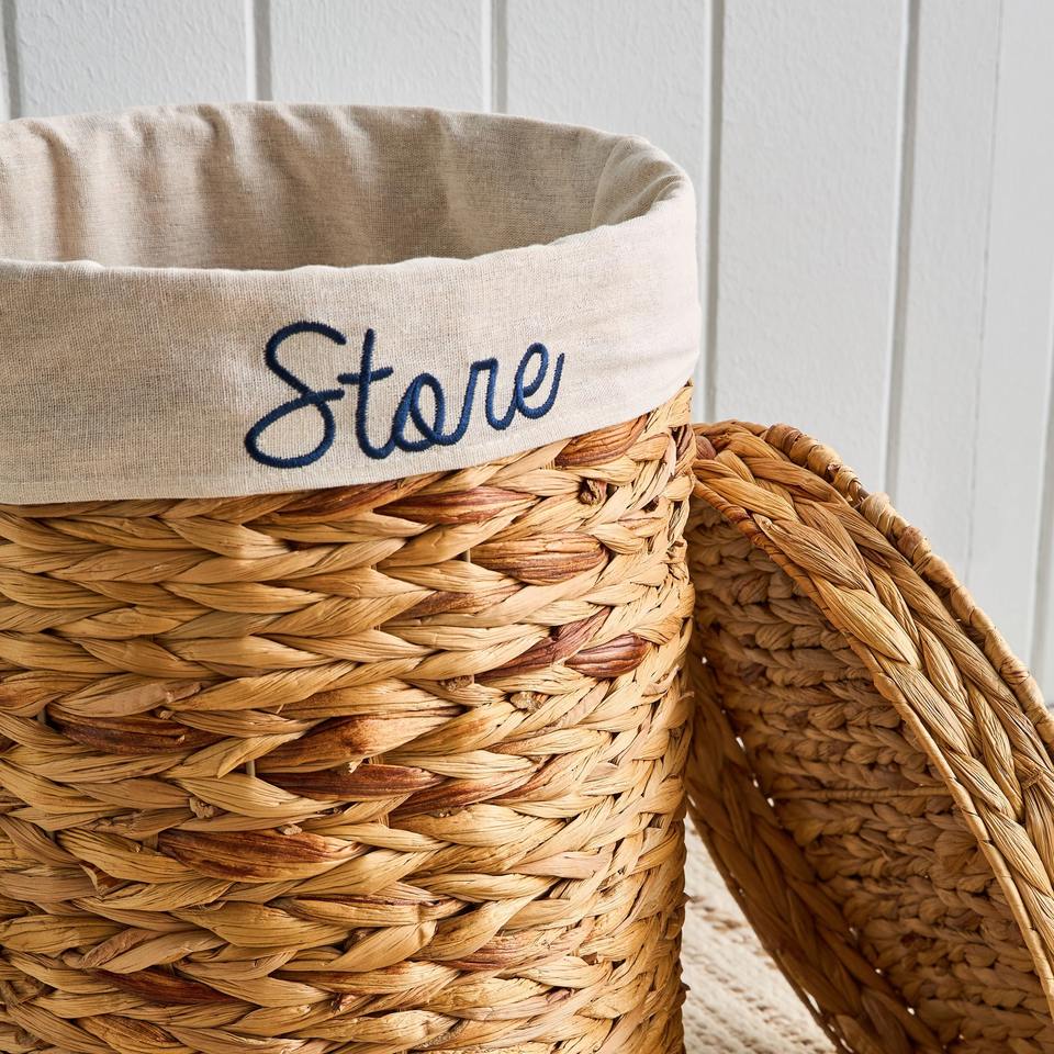 Round water hyacinth basket with fabric lining and lid