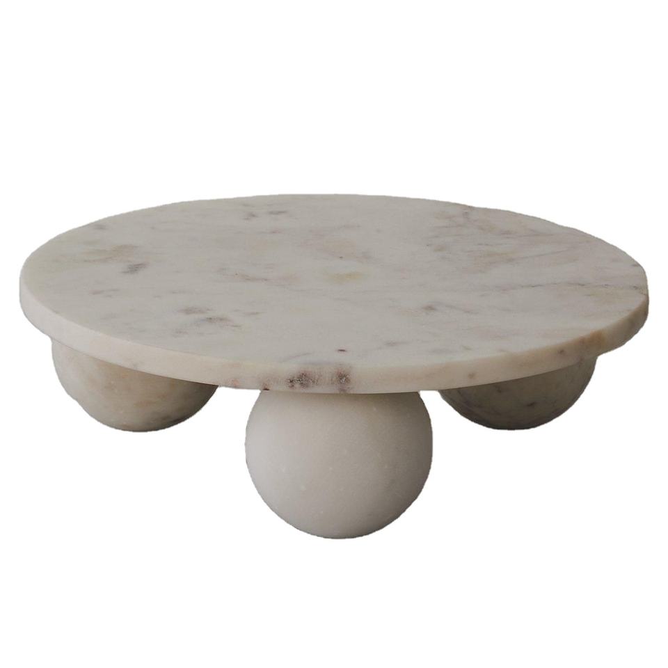 Round white marble tray ball legs handmade stone pedestal riser elegant decorative serving platter luxury cake stand hot sale