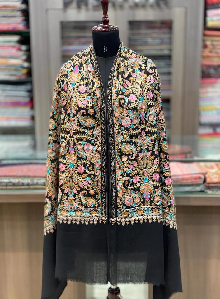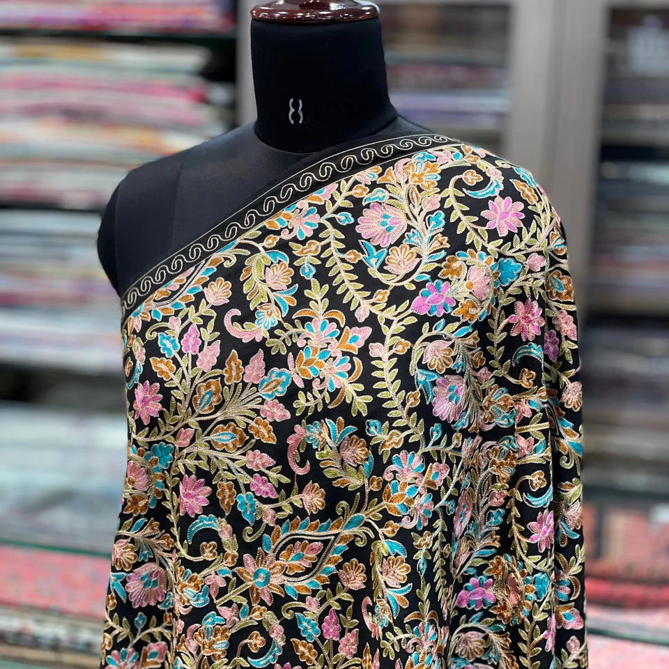 Royal Black Kashmiri Polyester Velvet Shawl Elegant Handmade Soft Breathable Embroidery Women's Stole Stylish Ethnic Design