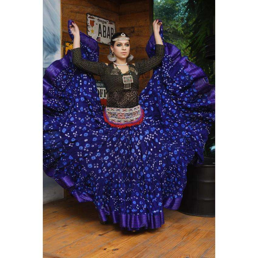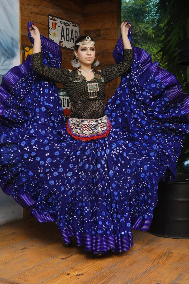 Royal Blue Bandhani Lehenga with Black Embellished Top Traditional Kuchi Embroidered Belt
