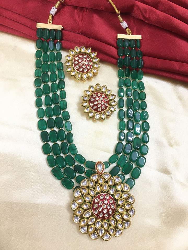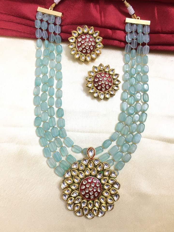 Royal Blue Beaded Necklace with Floral Kundan Pendant Floral Design Necklace and Earrings Set for Women for Wedding Engagement