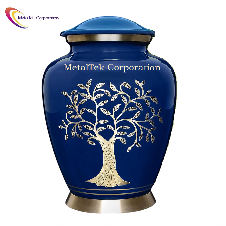Royal Blue Brass Cremation Urns Peace Tree Engraved Memorial Ashes Decorative Jars Customized Colors Wholesale Funeral Supplies