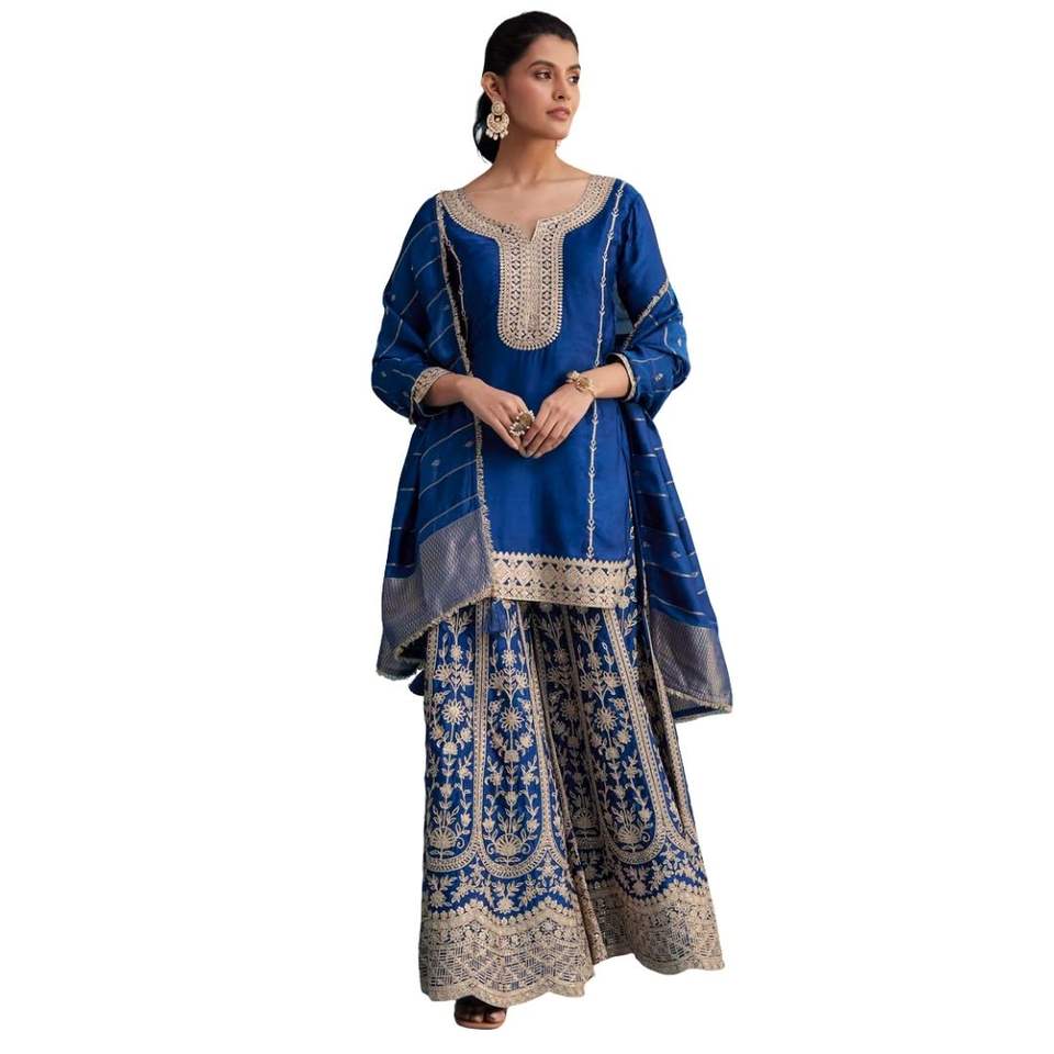 Royal Blue Silk Palazzo Set With Zari And Sequins Work Wholesale Women Ethnic Apparel OEM Clothing Factory Supplier Custom Suit