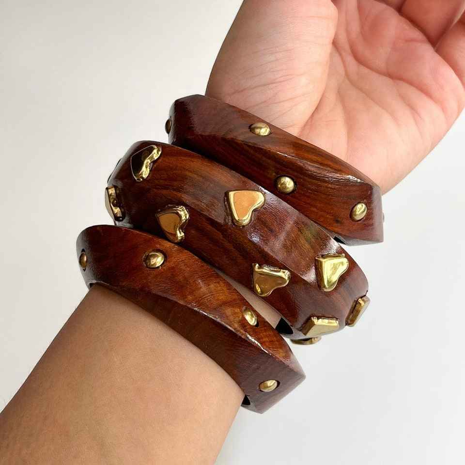 Royal Charm Wooden Bangles Deep Brown Wood with Metal Stud Highlights for Elegant Women Jewelry Collections