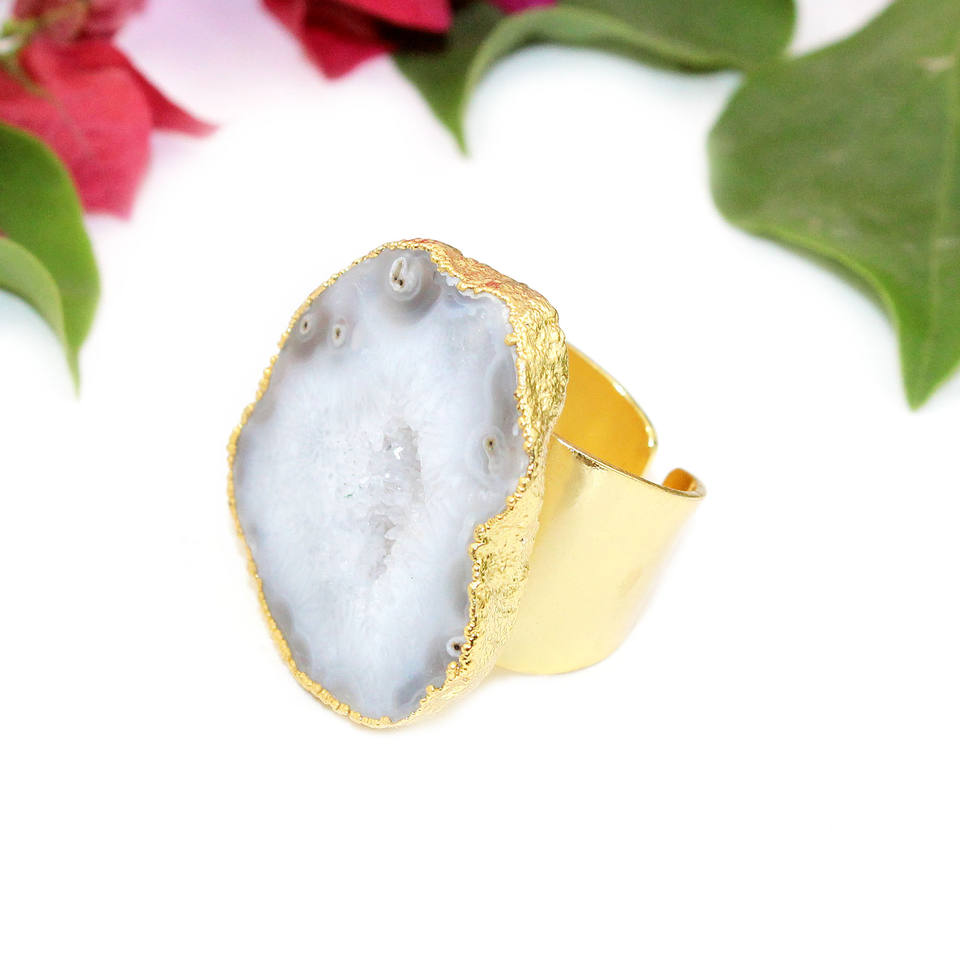 Royal Fashion Natural Geode Druzy 24K Gold Electroplated Adjustable Hammer Band Ring Finish Jewelry for Gifting Events
