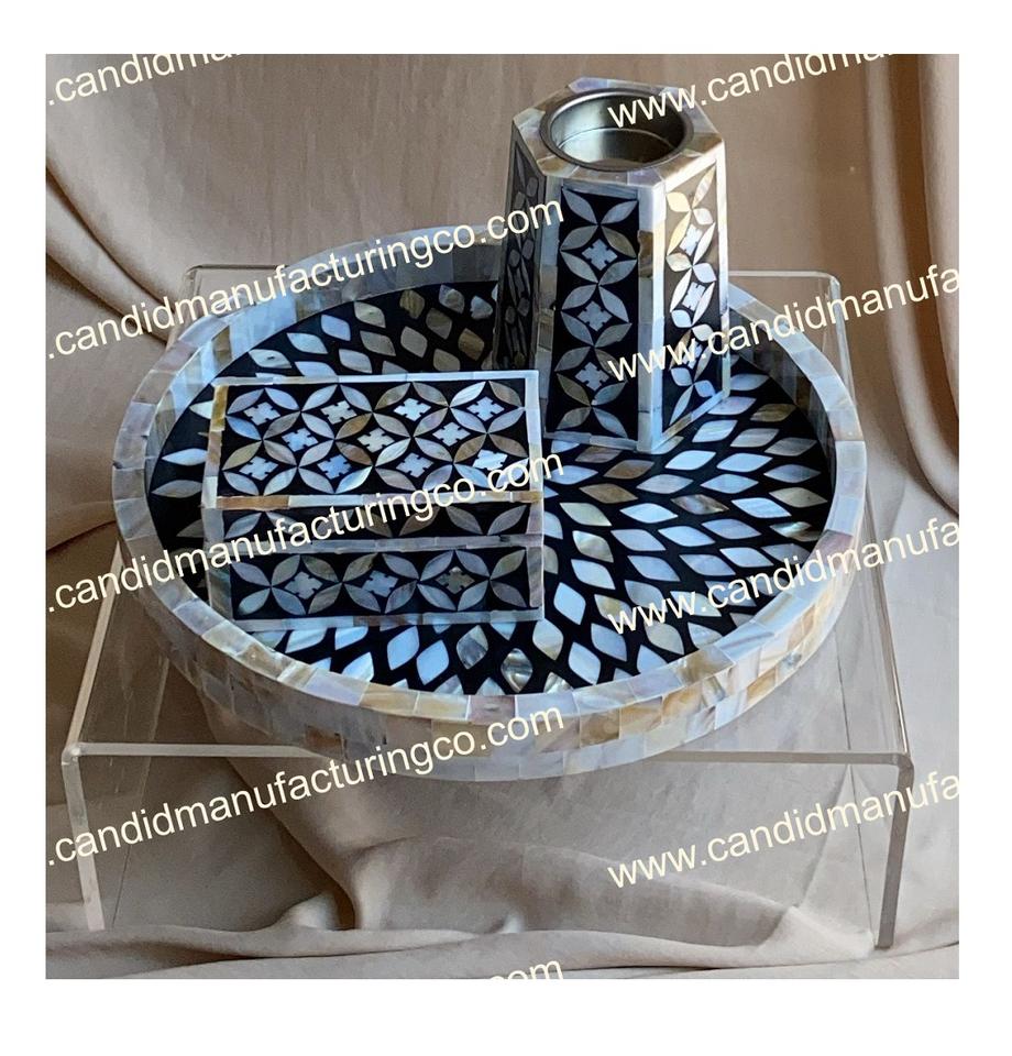 Royal Gifts Sets Novelty Mother of Pearl Tray and Box Round Serving Tray with Mobkhar for Ramadan Gifts