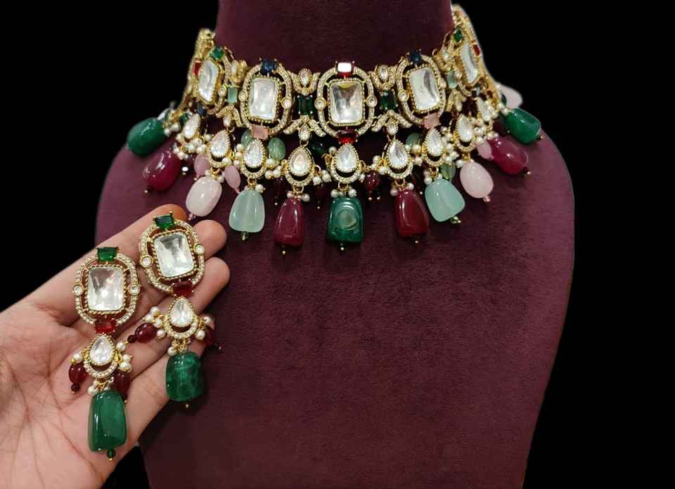 Royal Kundan Choker With Beaded Drops Regal Kundan Set With Hanging Stones Indian Jewelry for Party Designer Polki Necklace