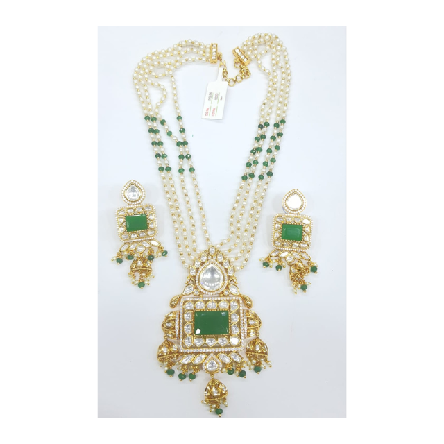 Royal Kundan Pendant Necklace Set with Green Stones and Earrings Designer Jewelry for Women Suitable for All Traditional Events