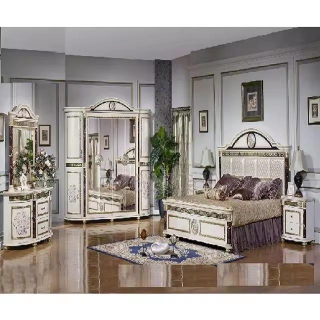 Royal Roman Style Bed and Bedroom Furniture Set Classic Creamy Look Bedroom Furniture Set French Victorian Style Carved Bedroom