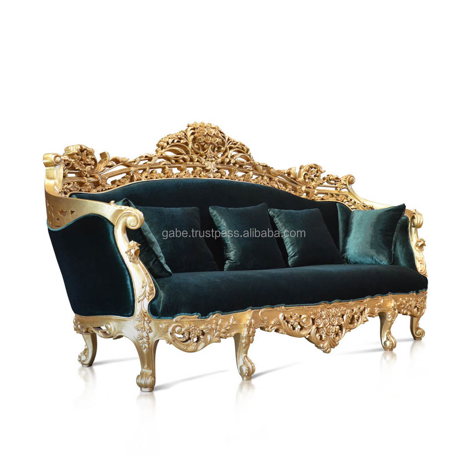Solid Gold Carved Royal Wedding Sofa Dark Green Fabric with Luxury Carving for Living Room Furniture