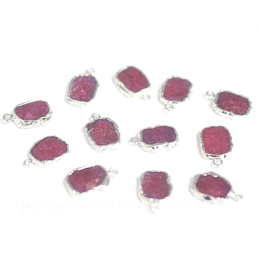Ruby Corundum Natural Stone Red Brass 16 to 18 MM with Bail Flat Rectangle Silver Plated Pendant Jaipur Gem Factory