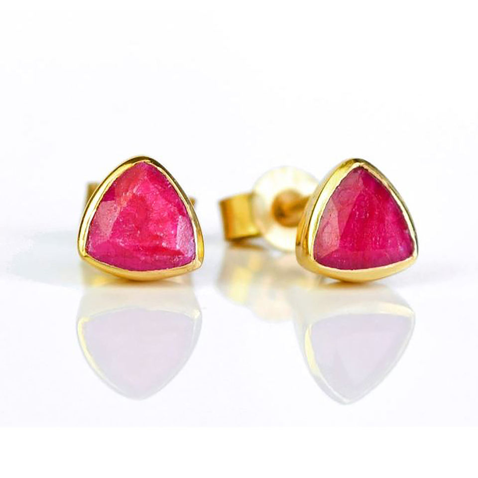 Ruby Gemstone Trillion Shape Bezel Set Gold Plated Studs Earrings 925 Sterling Silver Handmade Earrings Wholesale