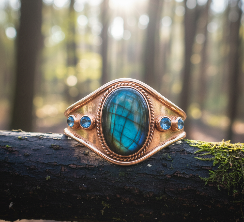 Rudra Gems Men's Bohemian Fashion Bracelet Handcrafted Natural Labradorite Cabochon High Quality Tibetan Silver Beaded 14K Gold