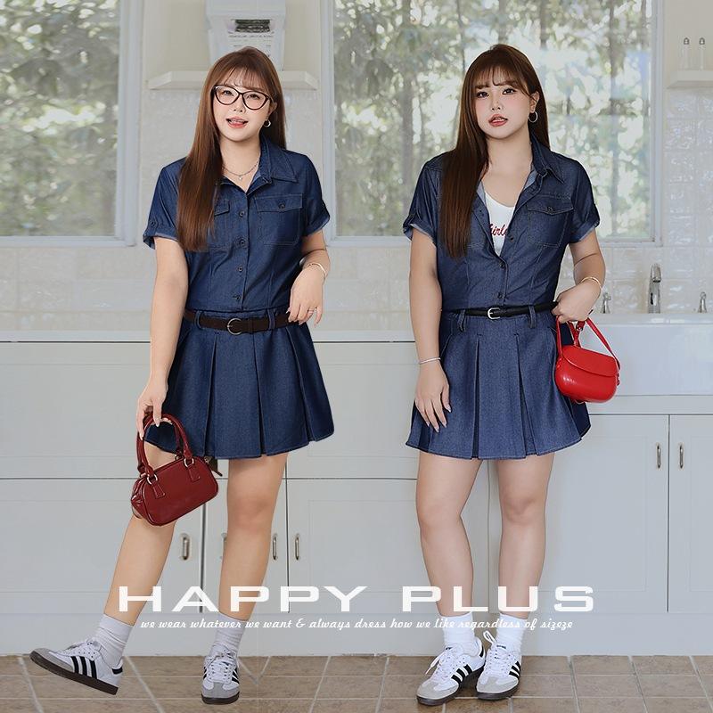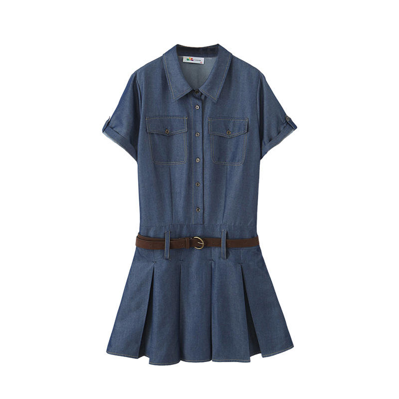 Runqi Denim Collared Dress With Belt Dark Blue Plus Size Casual Daily Wear Women's Solid Color Pleated Skirt Shirt Dress