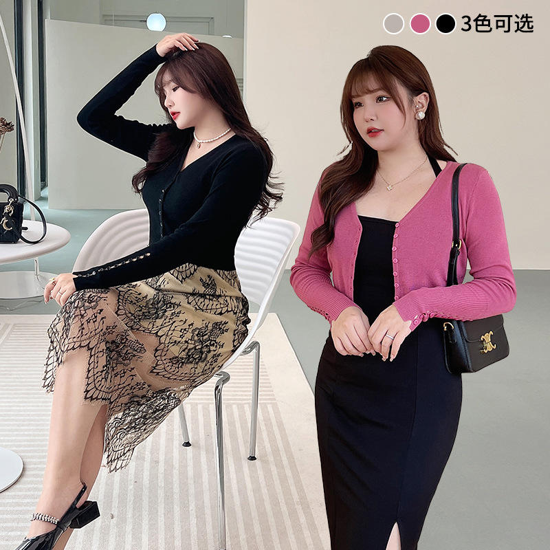 Runqi N8462 Women's Black Knit Cardigan Deep V-Neck Long Sleeve Crop Top With Buttons Solid Color Fashion Sweater Jacket