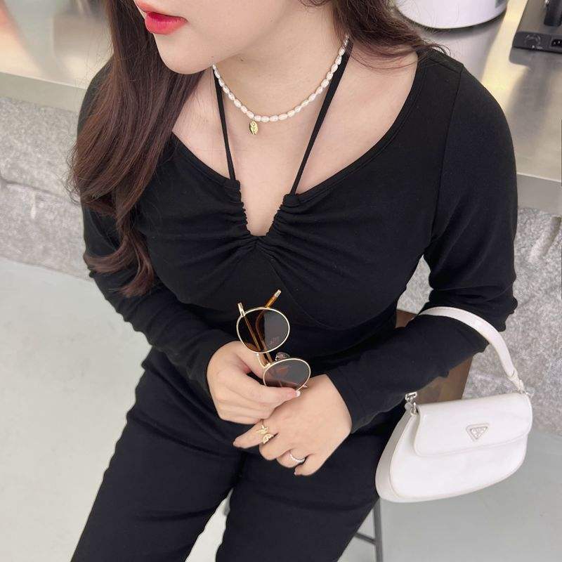 Runqi N8566 Women's Long Sleeve T-Shirt Halter V-Neck Solid Color Knitted Black Plus Size Fashion Top