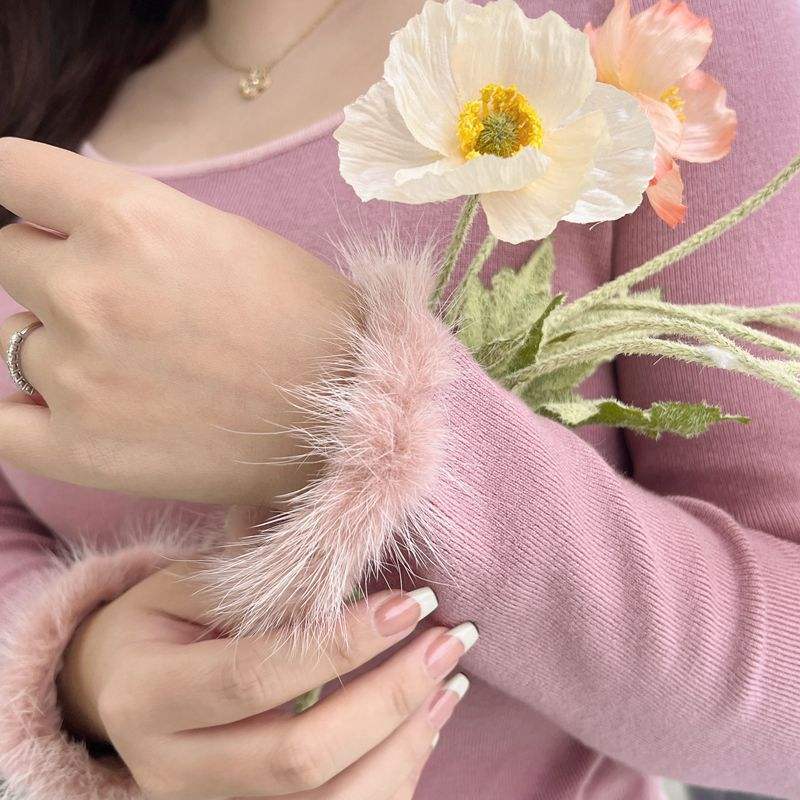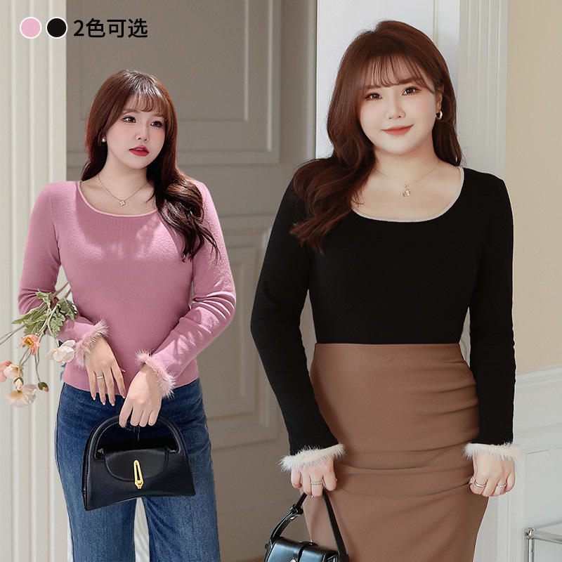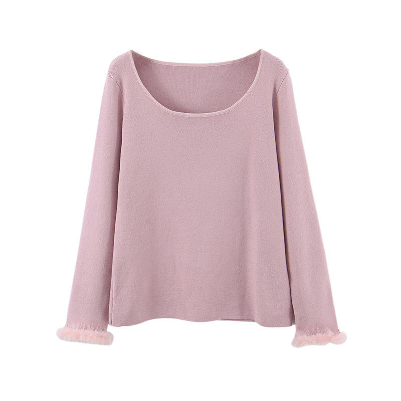 Runqi Plus Size Women's French Style Long Sleeve Knit Top With Fur Trim Round Neck Solid Color Polyester Sweater N8516