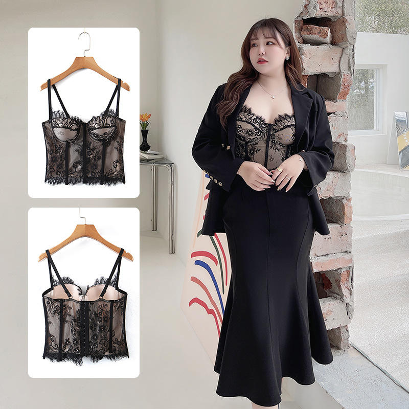 Runqi Women's Plus Size Lace Camisole N8353 Phantom Black Fishbone Bra Pads Sexy Backless Top
