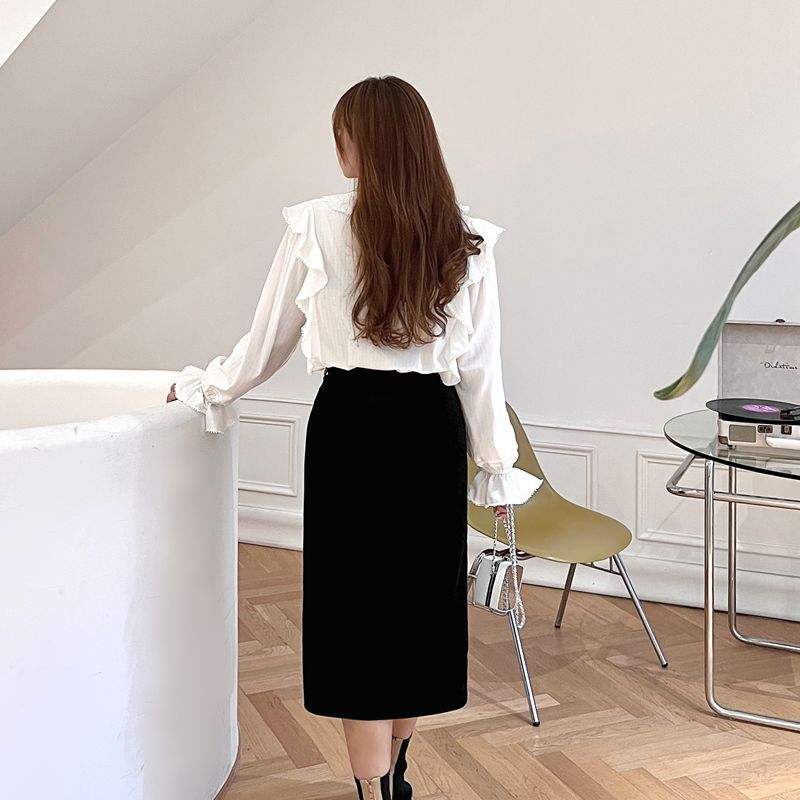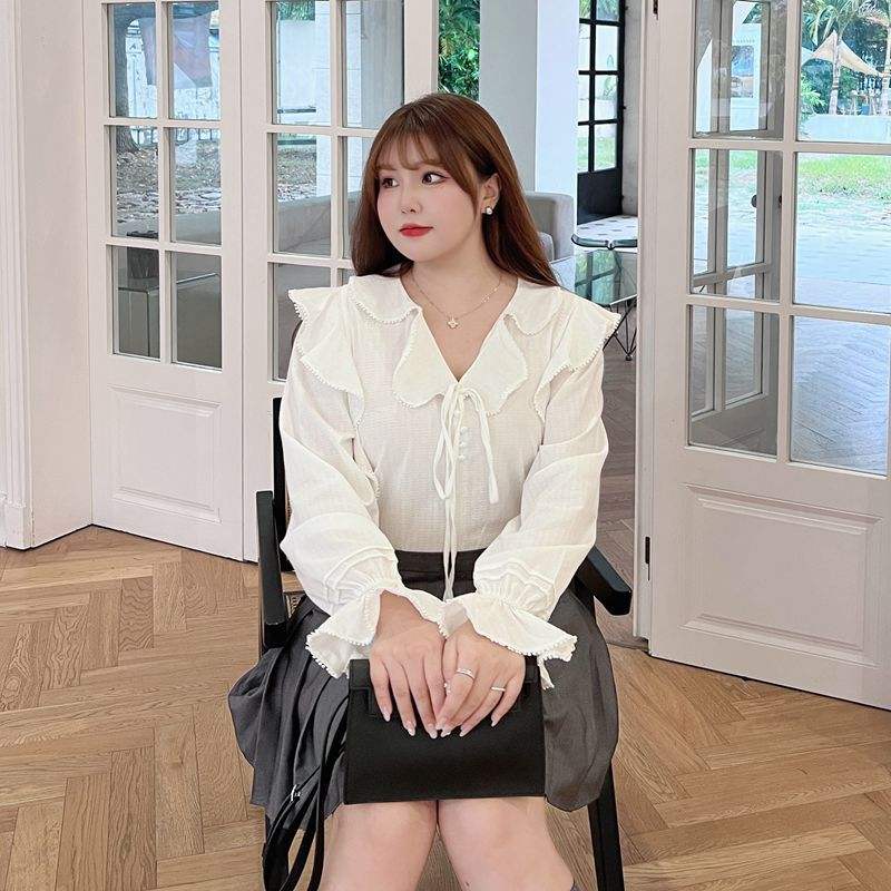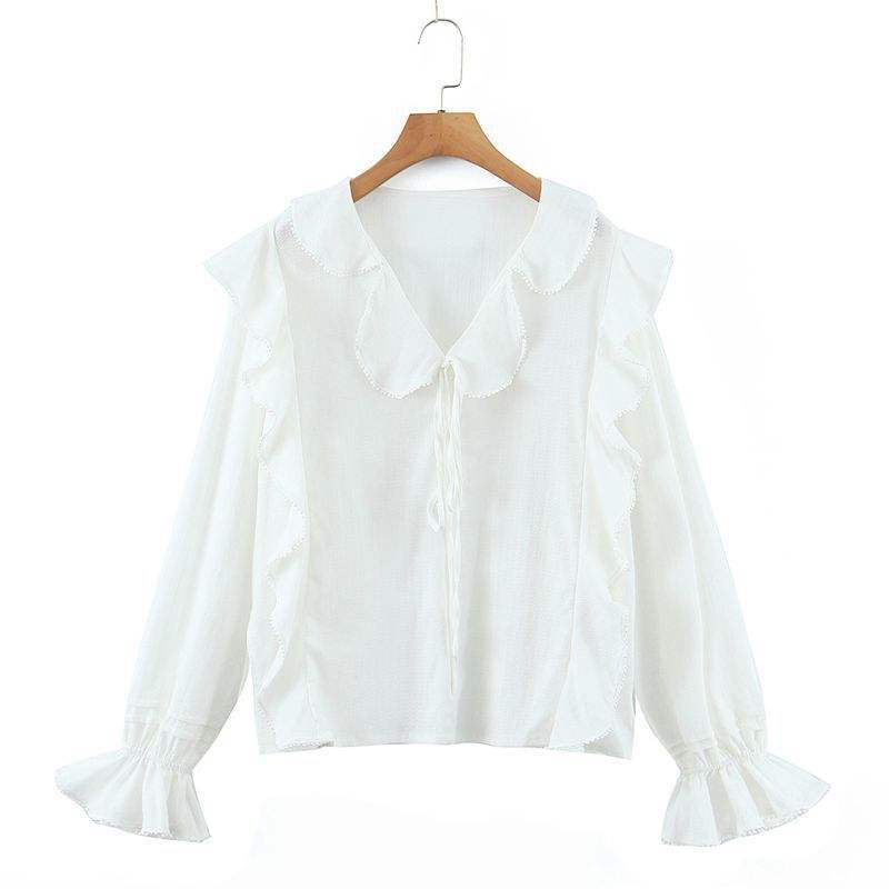 Runqi Women's White Chiffon Blouse N8335 Ruffle Collar Tie Neck Long Sleeve Everyday Shirt Solid Color Polyester Fabric
