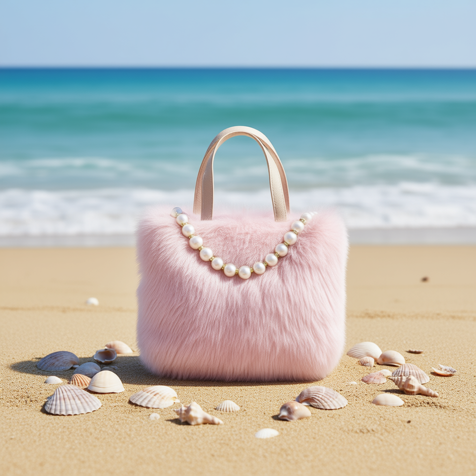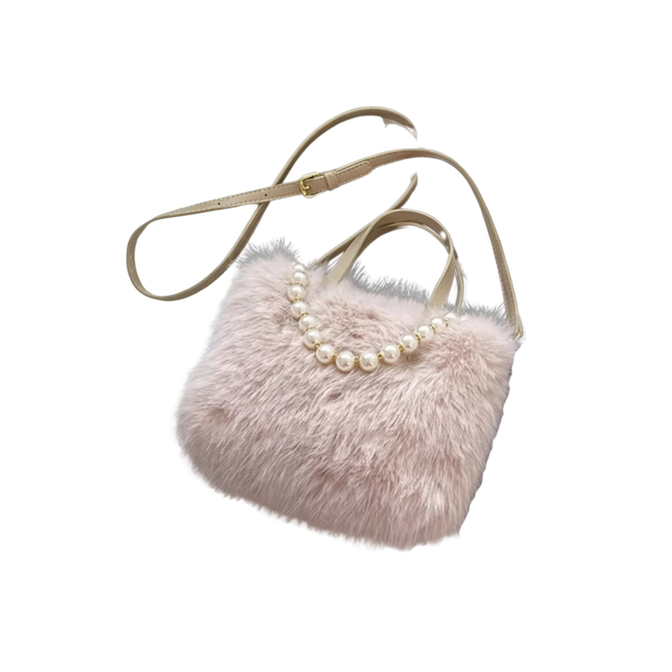 Ruobing Faux Fur Tote Bag Pearl Decoration Flap Closure Cross Body Two Handles Large Capacity Beach Handbag for Girls