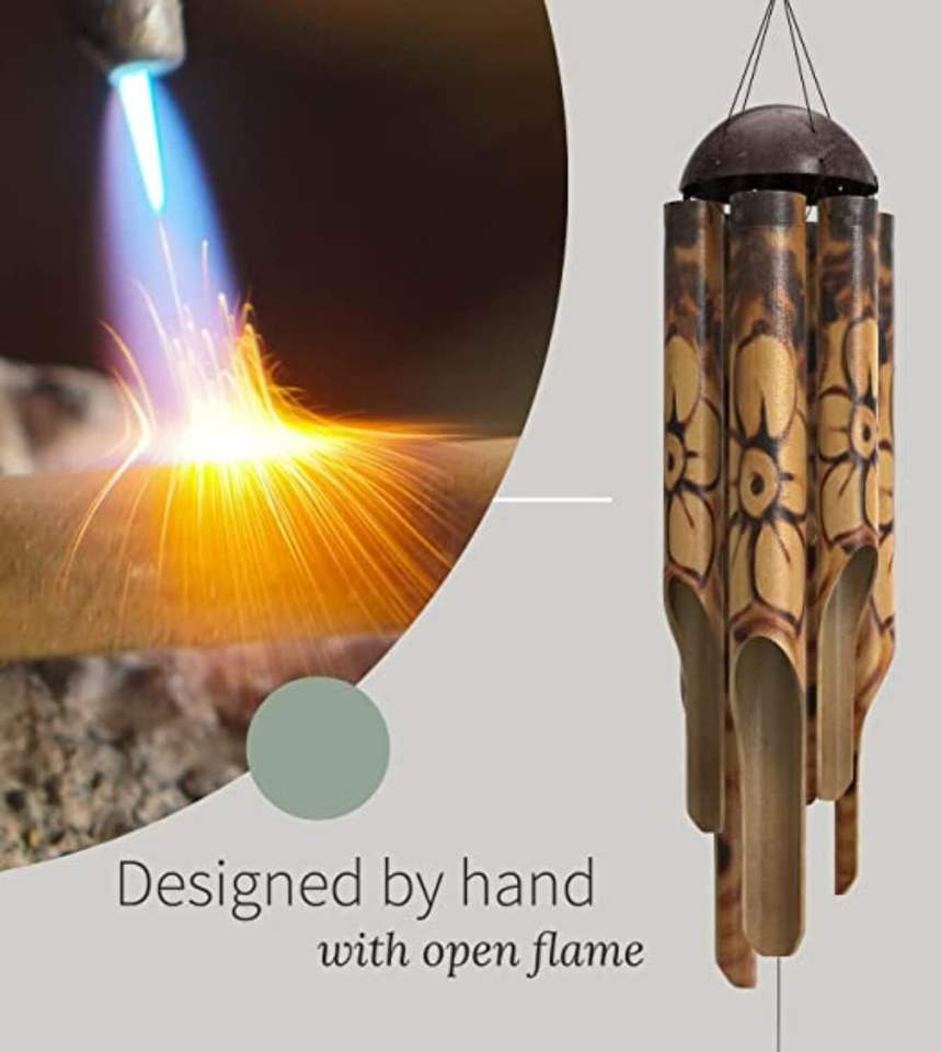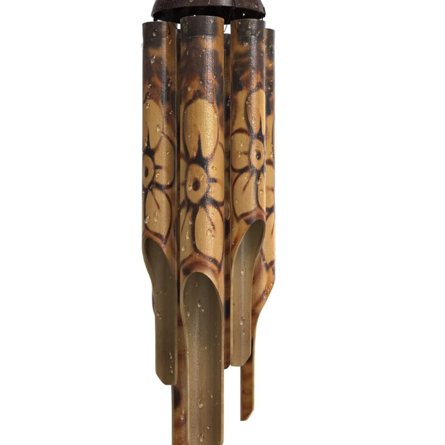 Rustic Bamboo Wind Chimes - Outside Outdoor Wooden Windchimes Large Floral Burned Design with Coconut Crown