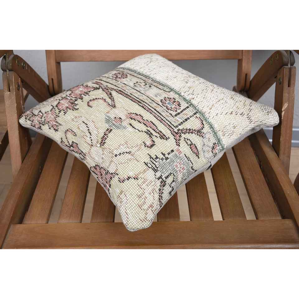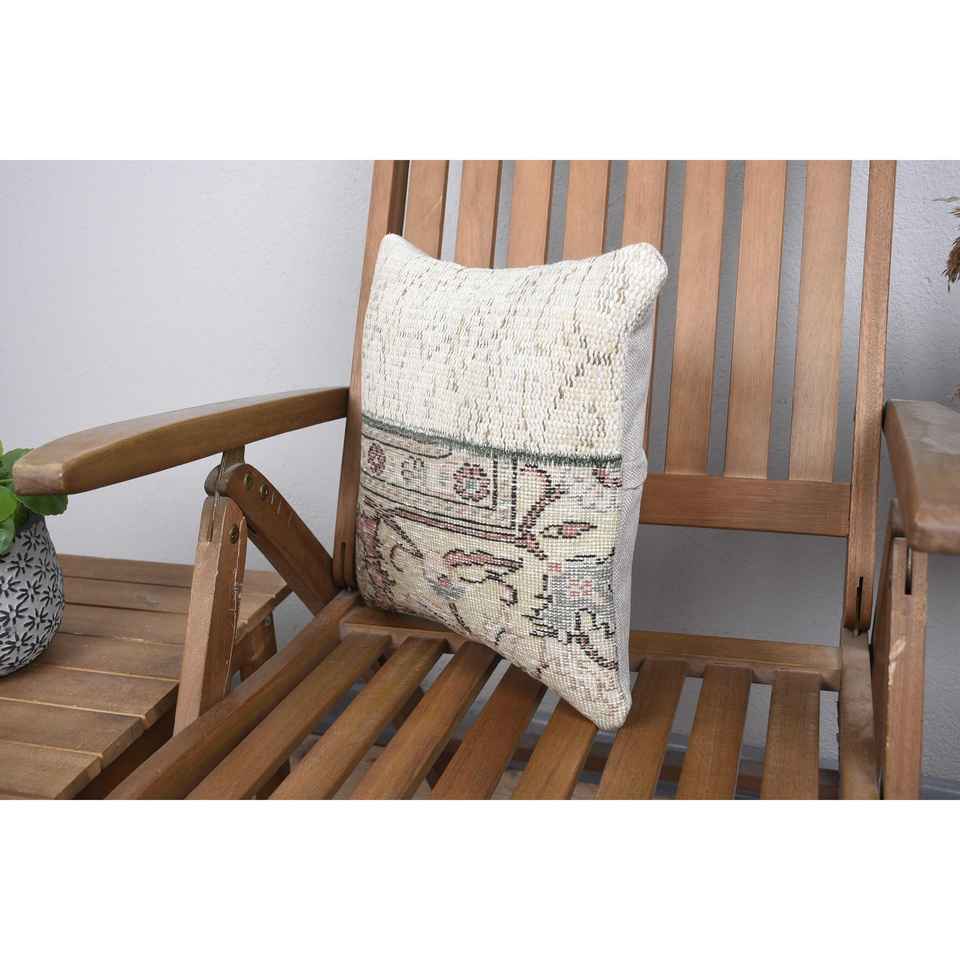 Rustic Design 14x14 Beige Kilim Patchwork Wool Pillow Luxury Style Vintage Fluffy Pattern with Plant Leaf for Kitchen Sofa Use