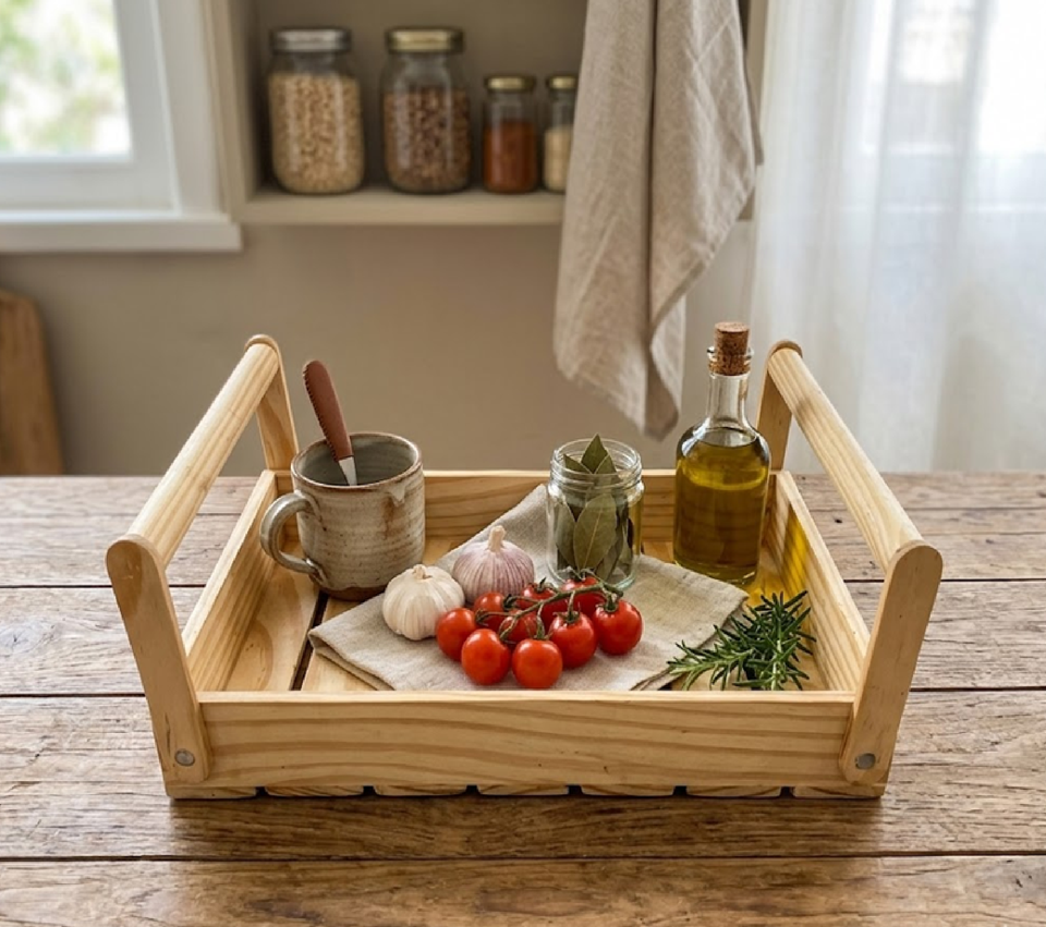 Rustic Pine Wood Rectangular Basket Sturdy Handles Standing Type Easy Carrying Handmade Kitchen Storage Decorative Household