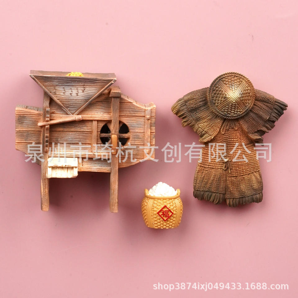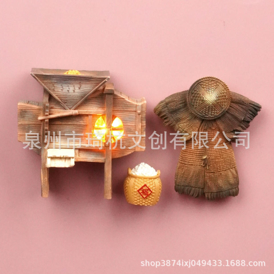 Rustic Refrigerator Magnets Vintage Rice Threshing Cart And Raincoat Set Handmade Decorative Gift For Home Kitchen